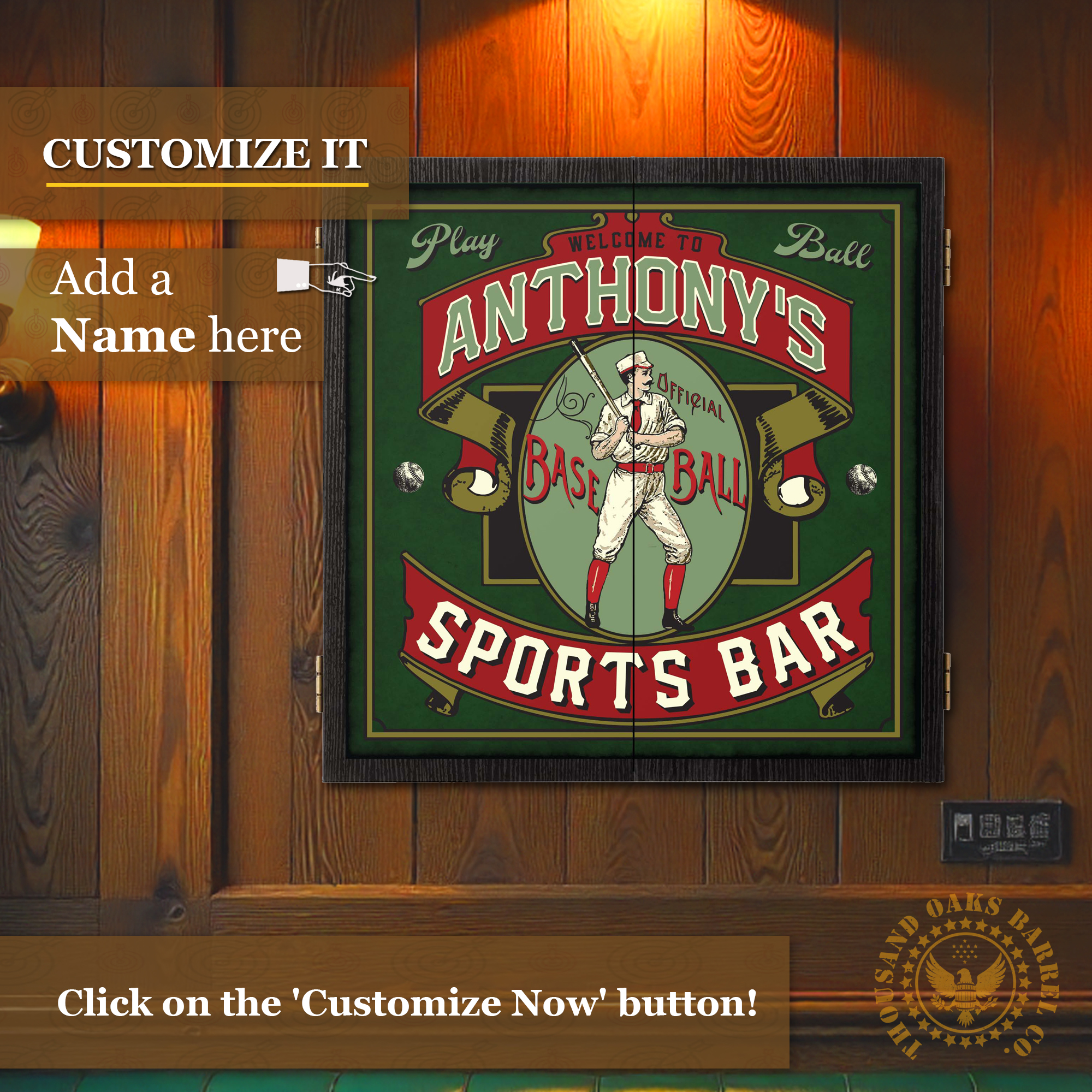 Create your own legendary game room with our Personalized Baseball Sports Bar Dartboard Cabinet Set, custom printed with your name in a vintage sports bar design. This high-quality wall-mounted dartboard cabinet features a classic baseball theme with bold typography, retro artwork, and a fully customized name drop printed directly onto the cabinet doors.