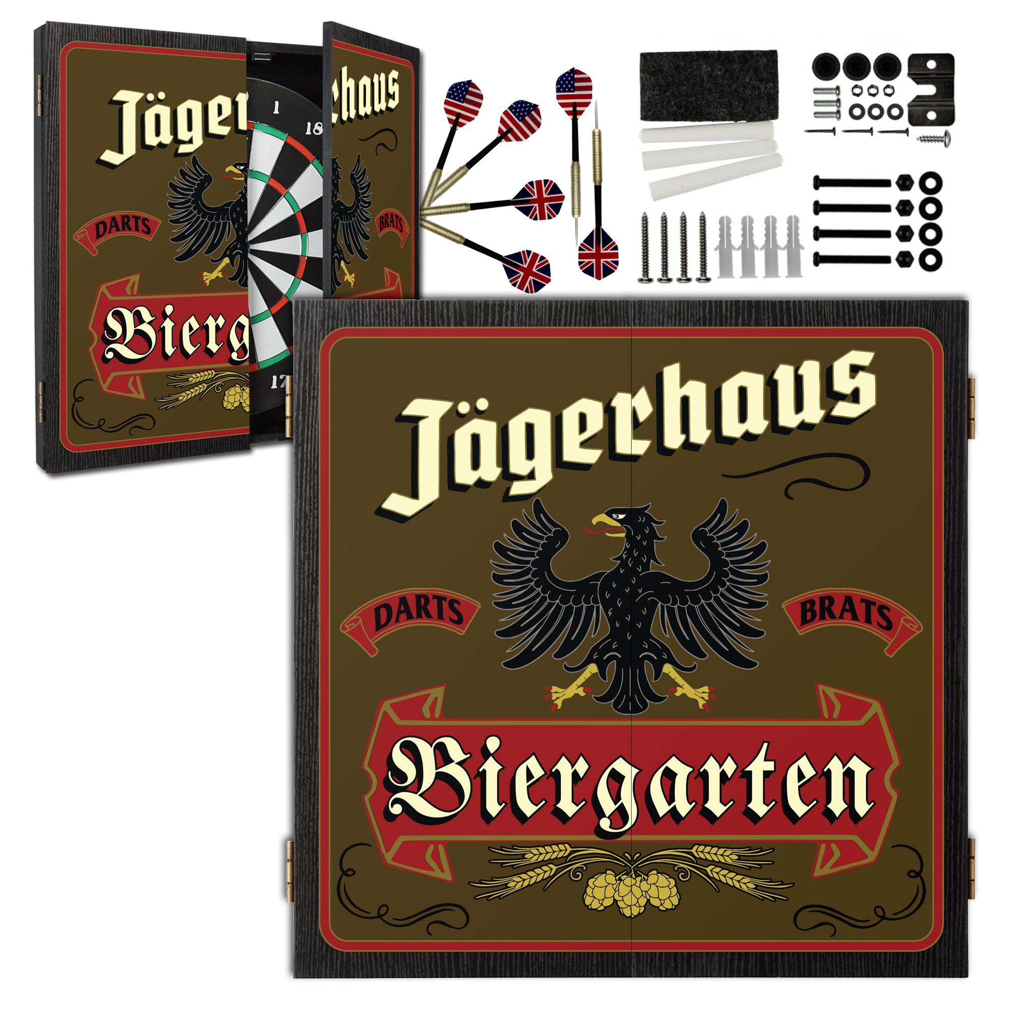 Bring Old World charm and classic pub fun into your home with this Personalized Biergarten Dartboard Cabinet Set. Inspired by traditional German beer hall signage, this bold design features rich colors, vintage typography, and iconic Bavarian-style artwork—customized with your name or family name to create a truly one-of-a-kind centerpiece.