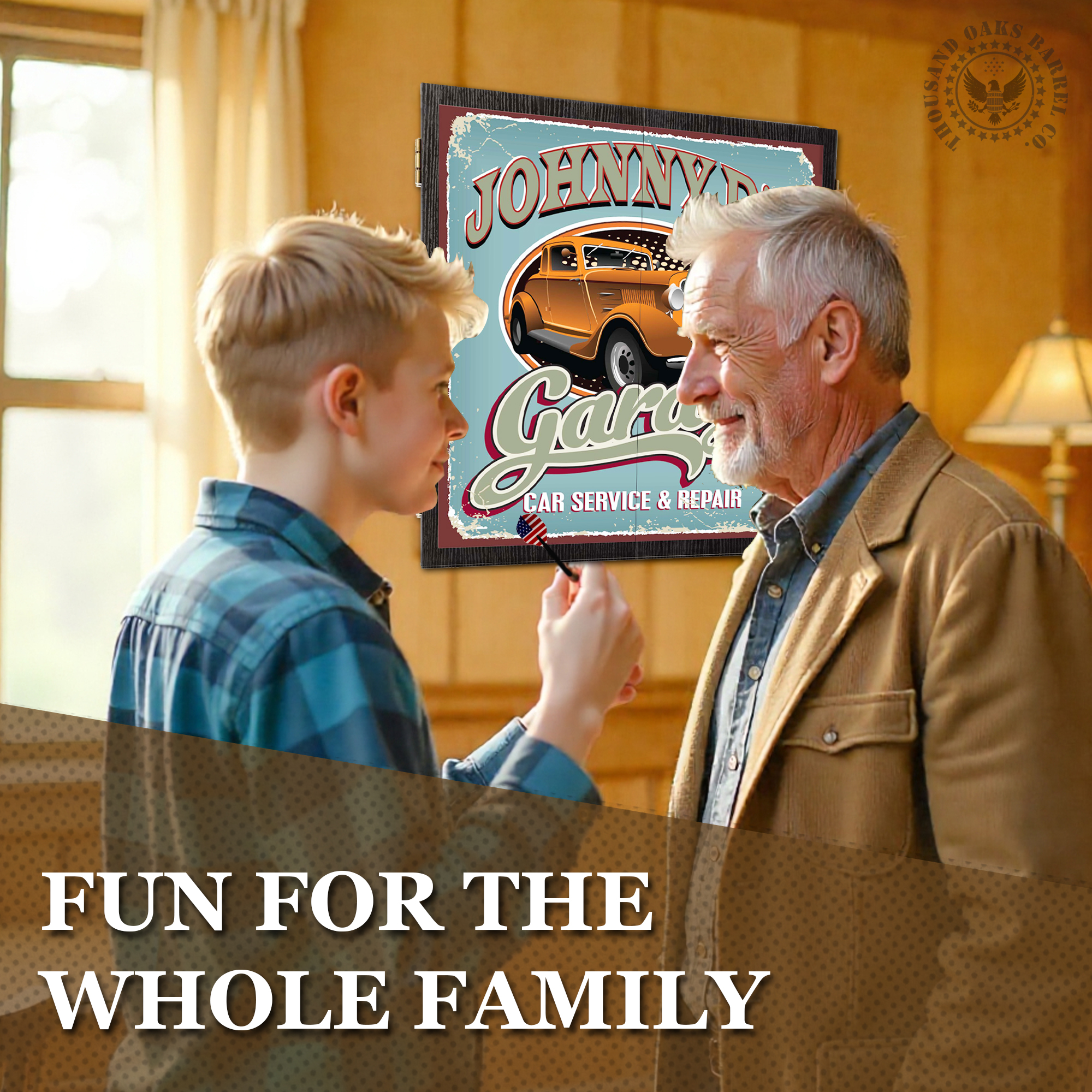 Perfect for car enthusiasts, mechanics, hot rod fans, or anyone who loves classic Americana décor, this personalized dartboard set makes an unforgettable gift for birthdays, Father’s Day, holidays, or garage upgrades.