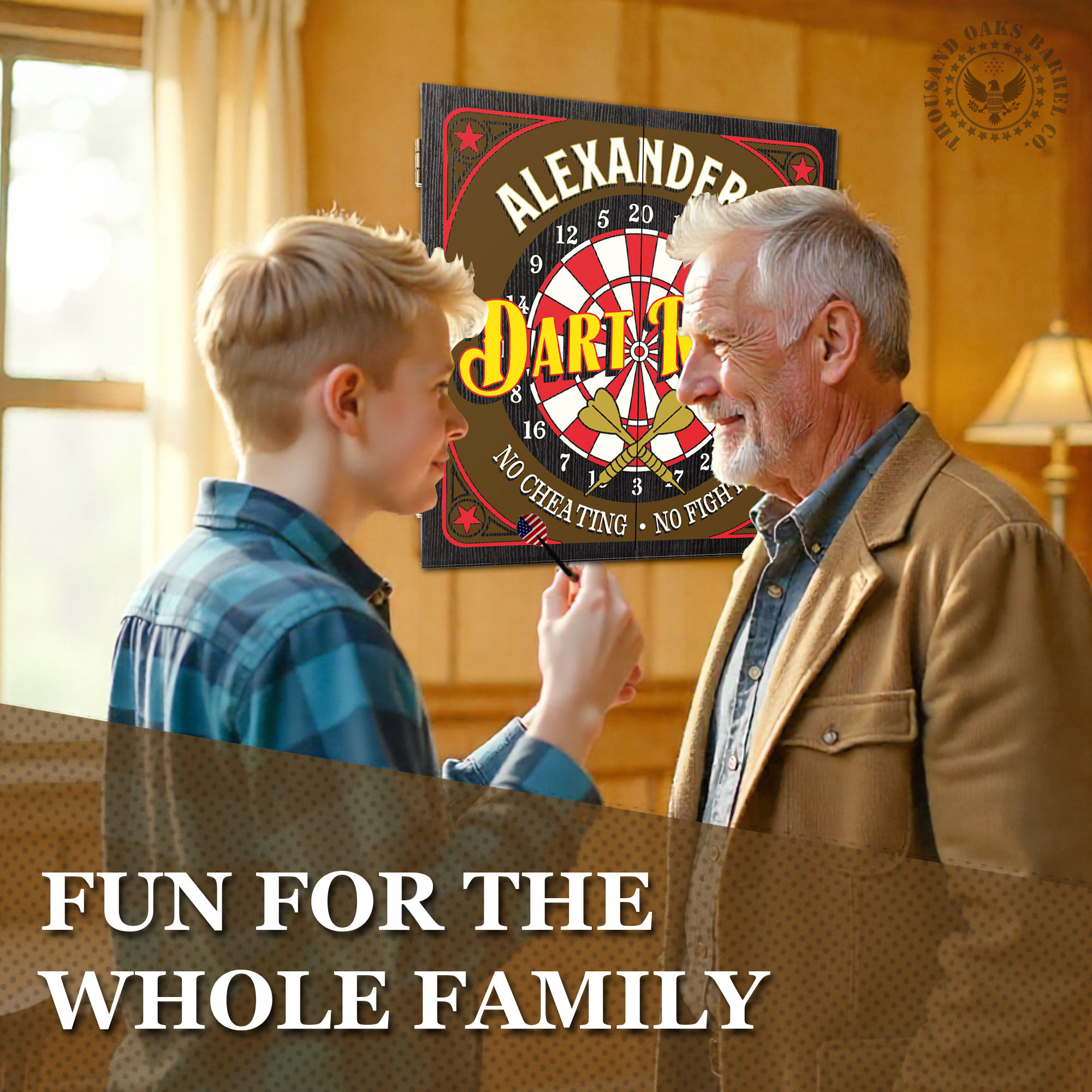 ✔ Personalized Cabinet with Graphic – A wooden dartboard cabinet finished in matte black with your custom name or design on the doors.