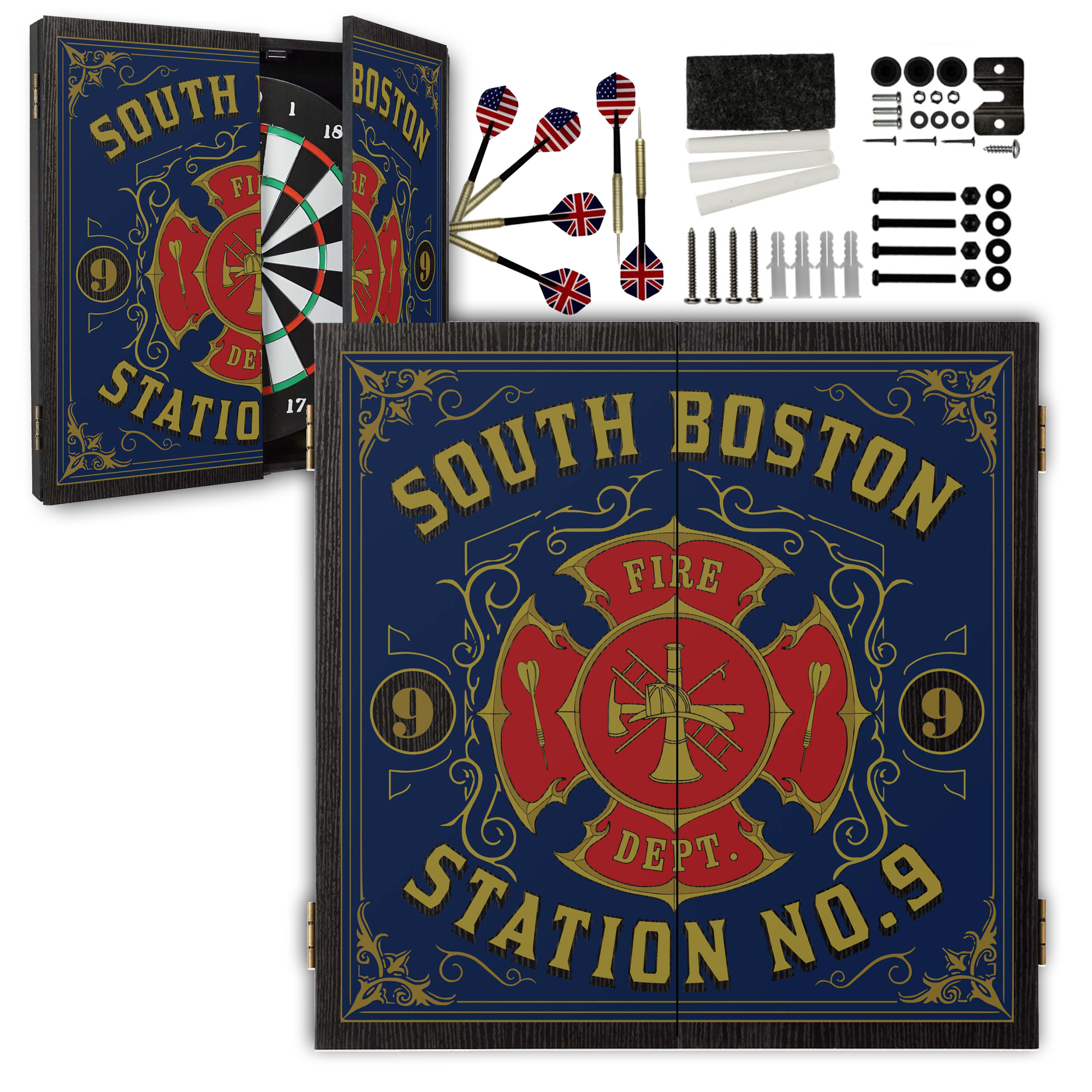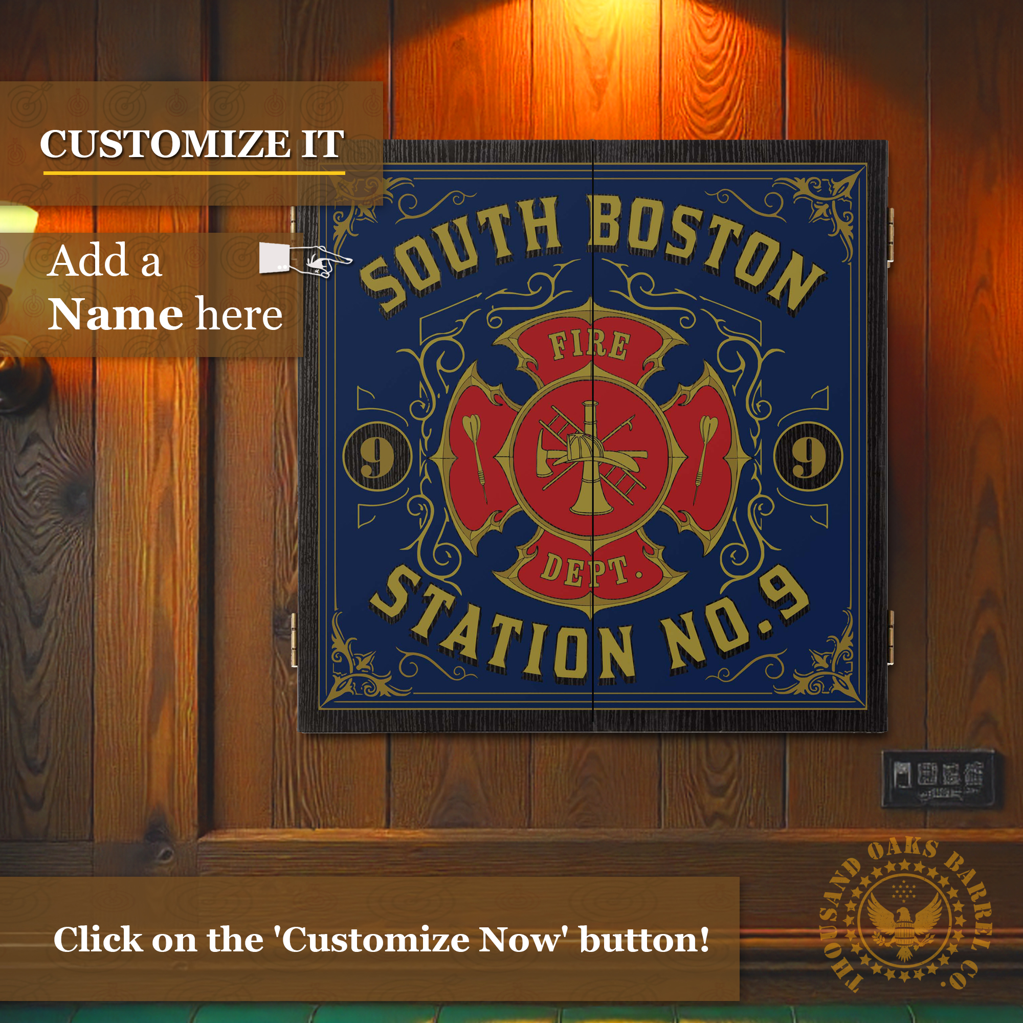 Honor the pride and tradition of the fire service with this Personalized Fire Department Dartboard Cabinet Set, custom printed with your firefighter’s name, city, department, and station number. Designed with a bold fire department Maltese cross emblem and classic station typography, this custom dartboard cabinet is the perfect addition to any firehouse, home bar, man cave, game room, or firefighter retirement gift.