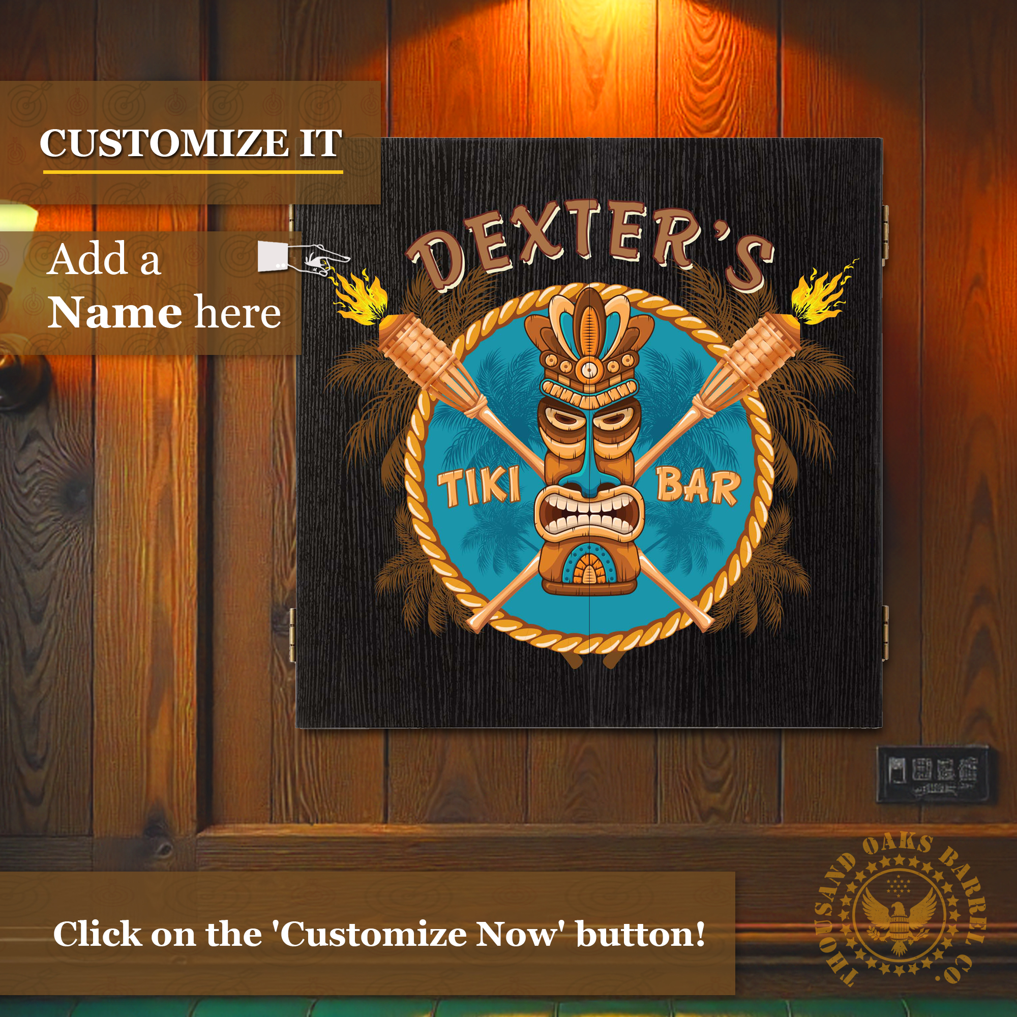 Turn your home into a tropical getaway with this Personalized Tiki Bar Dartboard Cabinet Set, custom printed with your name for a bold island-inspired statement piece. Featuring a vibrant tiki mask design with crossed torches and palm silhouettes, this custom dartboard cabinet instantly transforms any home bar, man cave, game room, basement, patio lounge, or outdoor entertainment space into a tropical tiki retreat.