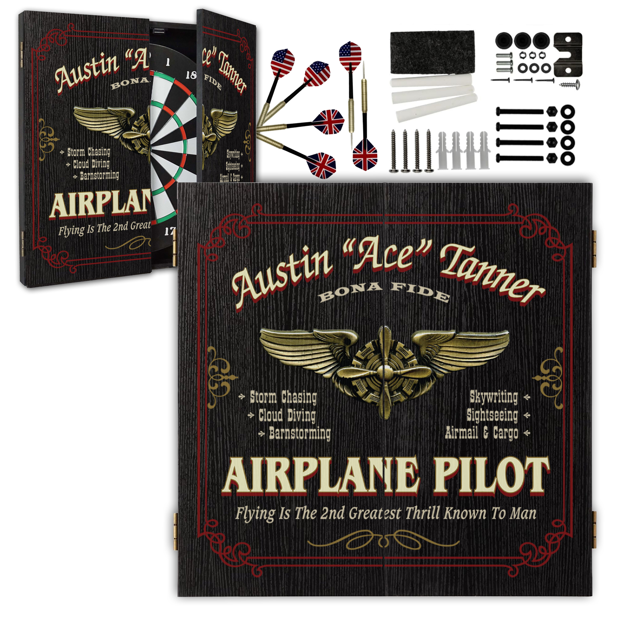 This premium custom dartboard cabinet features your pilot’s name prominently displayed in a vintage aviation design with wings emblem, making it the ultimate personalized pilot wall decor for offices, home bars, man caves, hangars, and game rooms.