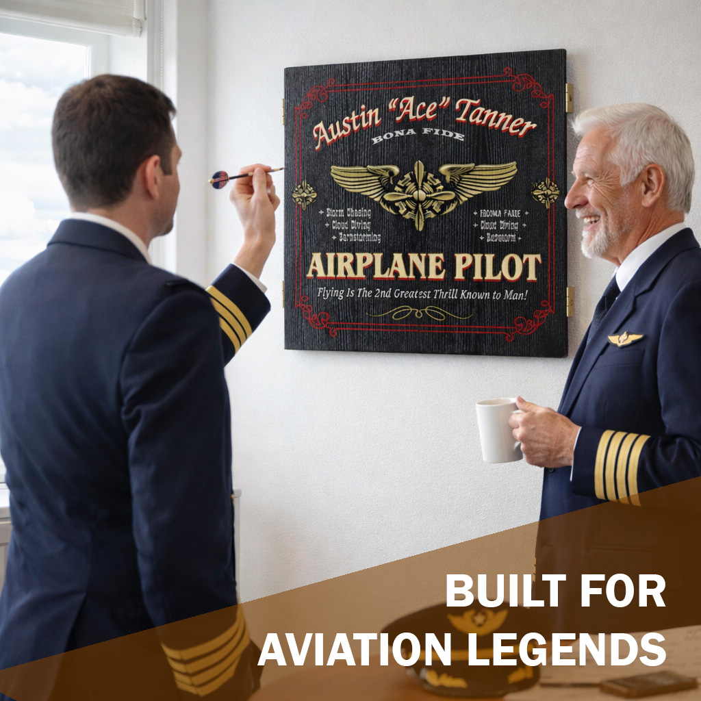 Honor the aviator in your life with this Personalized Airline Pilot Dartboard Cabinet Set, a bold and custom aviation gift designed for captains, commercial pilots, flight instructors, and aviation enthusiasts.
