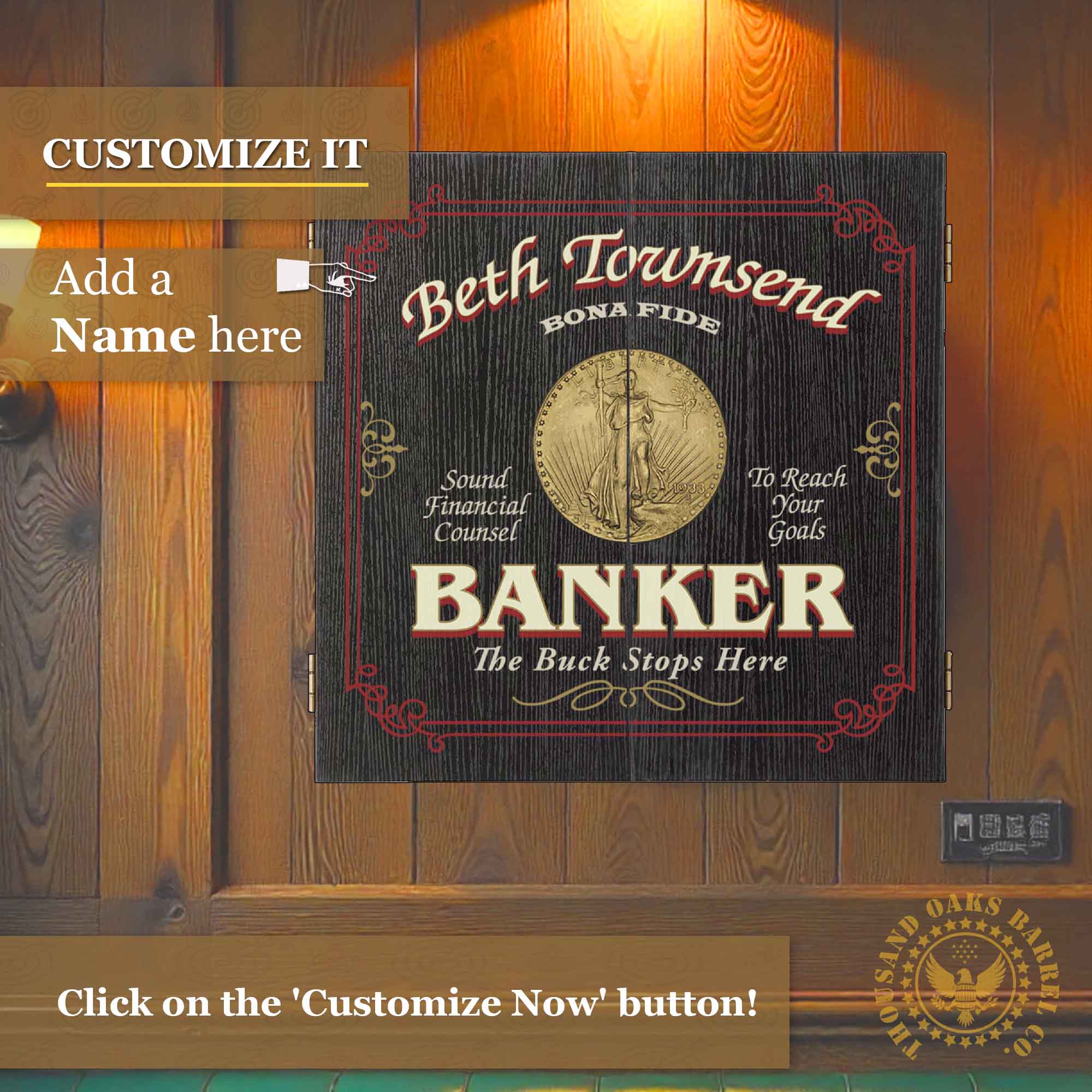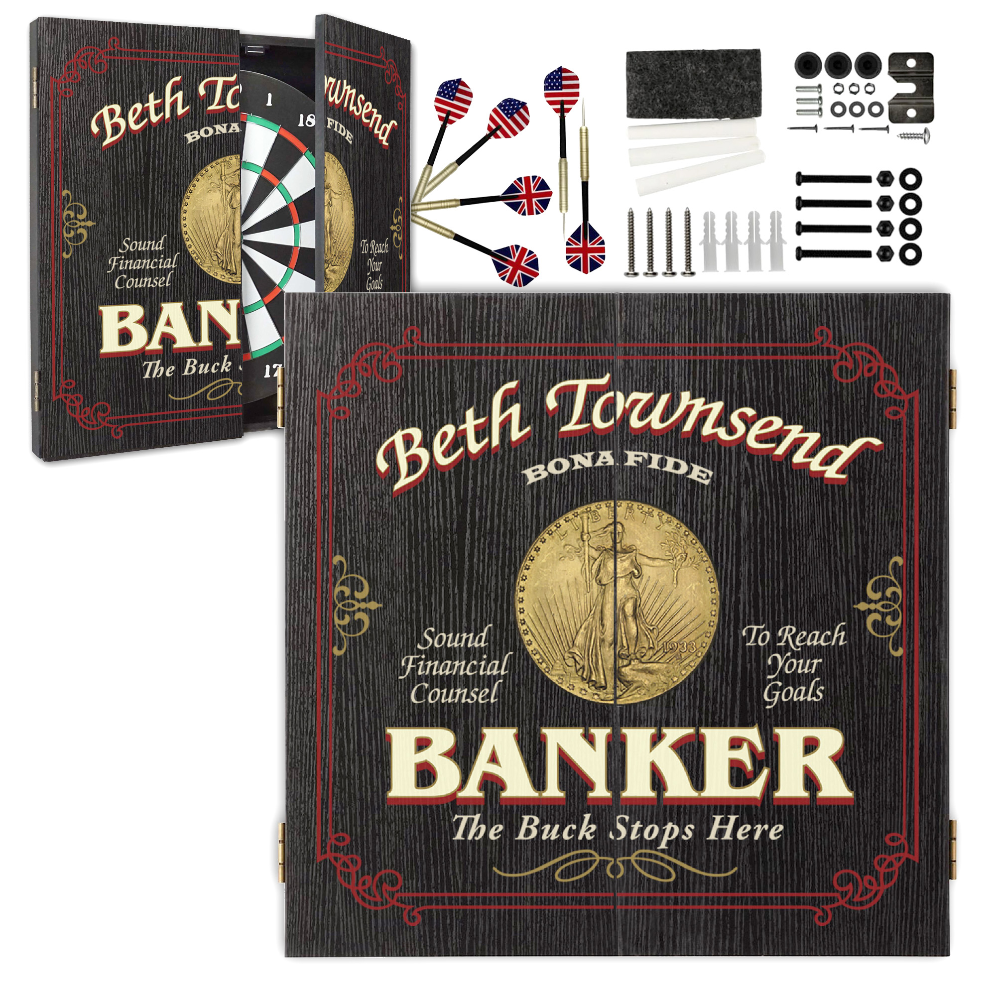 This beautifully crafted personalized dartboard cabinet features a bold banker-themed design with space to add any name directly into the artwork — creating a one-of-a-kind gift for bankers, financial advisors, investment professionals, or anyone in finance.