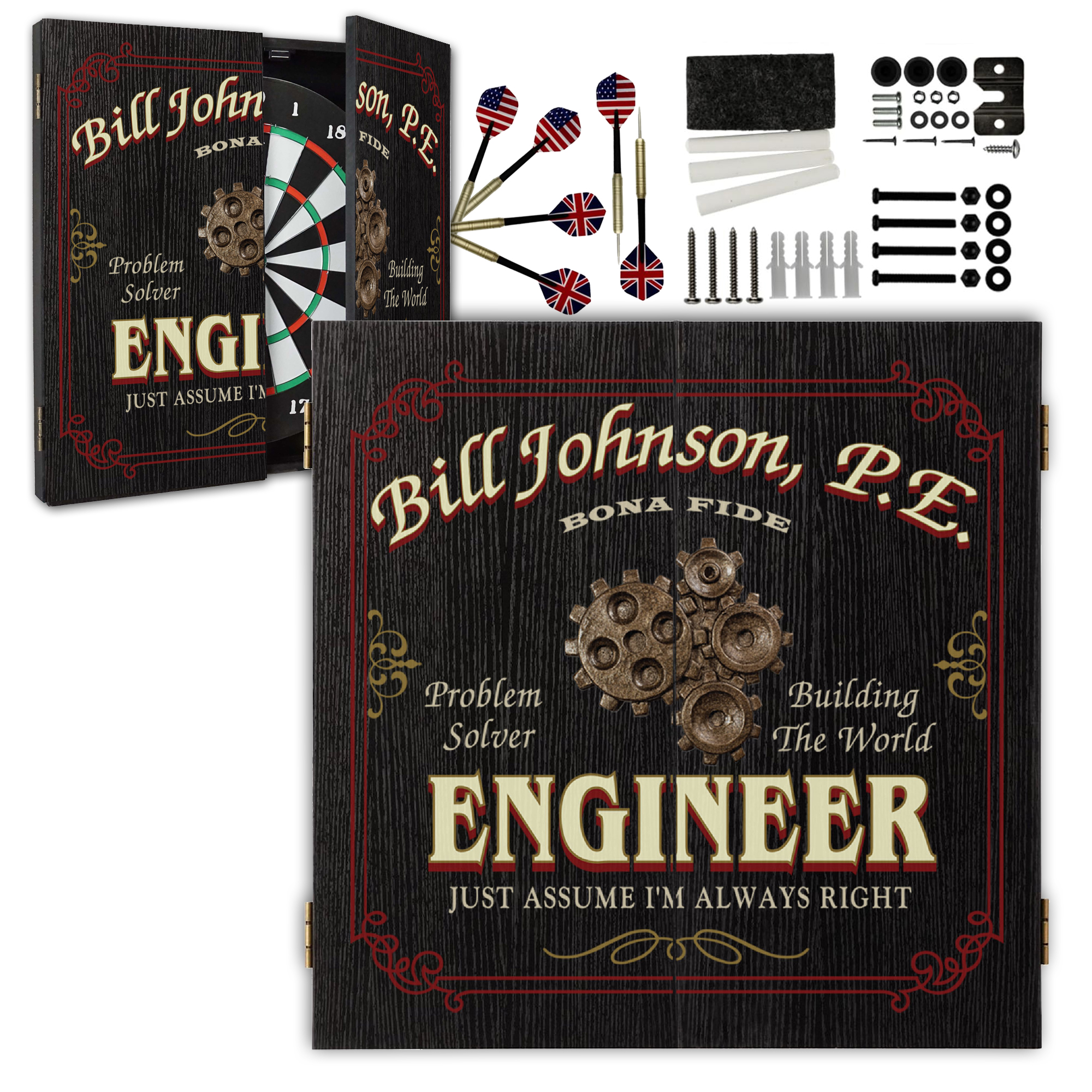 Whether you're shopping for a mechanical engineer gift, civil engineer gift, electrical engineer gift, graduation gift, retirement gift, Father’s Day gift, or birthday gift for an engineer — this personalized dartboard cabinet is guaranteed to impress.