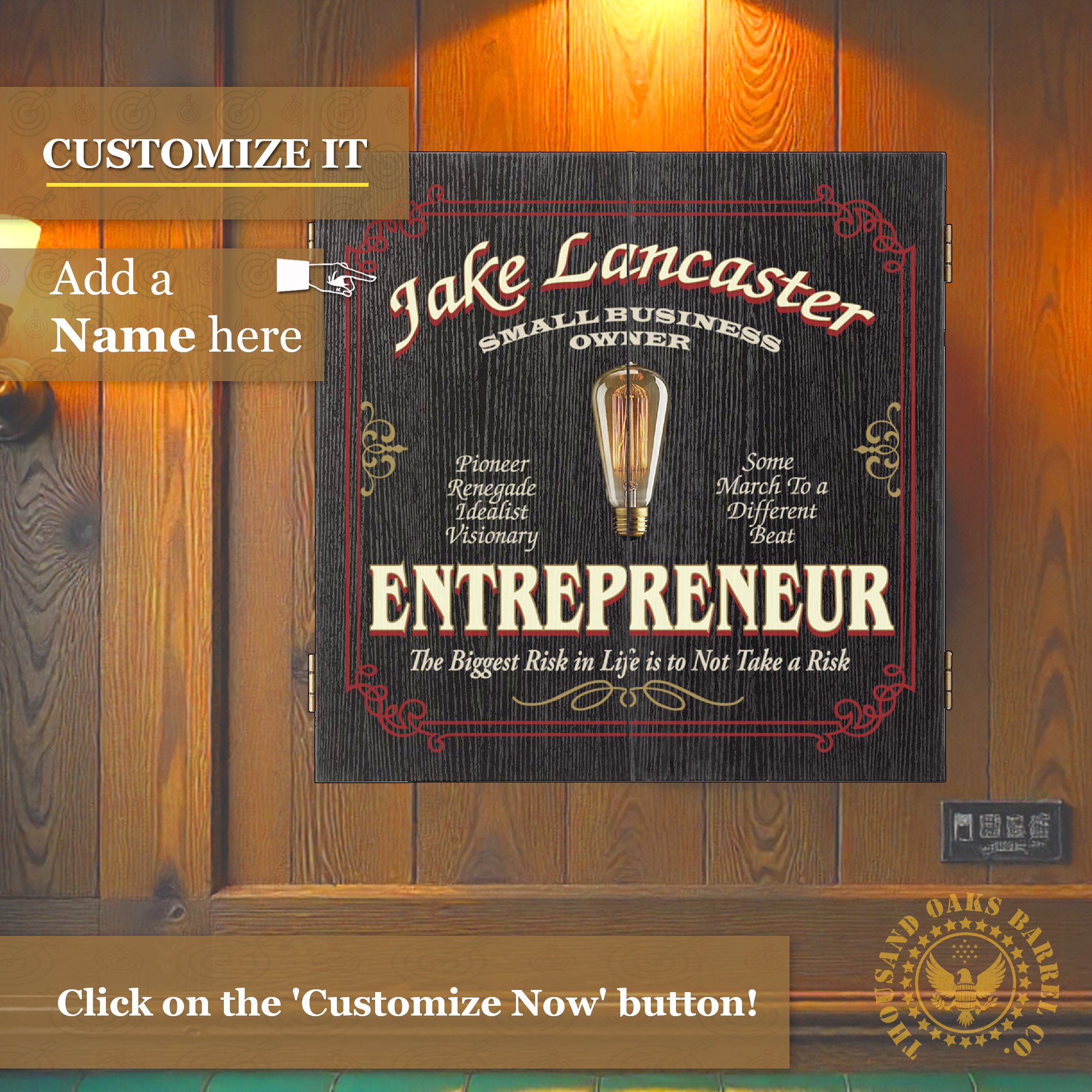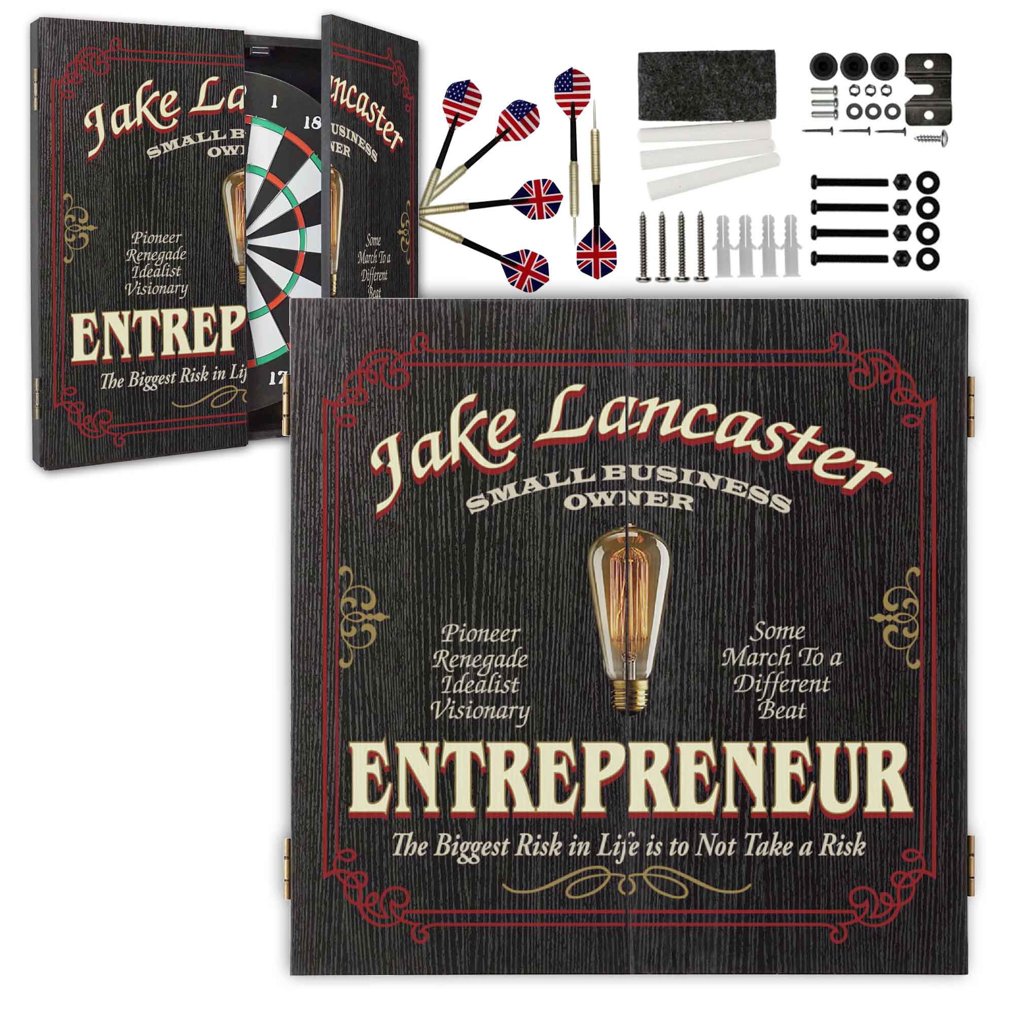 Celebrate the bold spirit of business ownership with this Personalized Entrepreneur Dartboard Cabinet Set — a custom name dartboard designed for visionaries, small business owners, startup founders, and risk-takers.