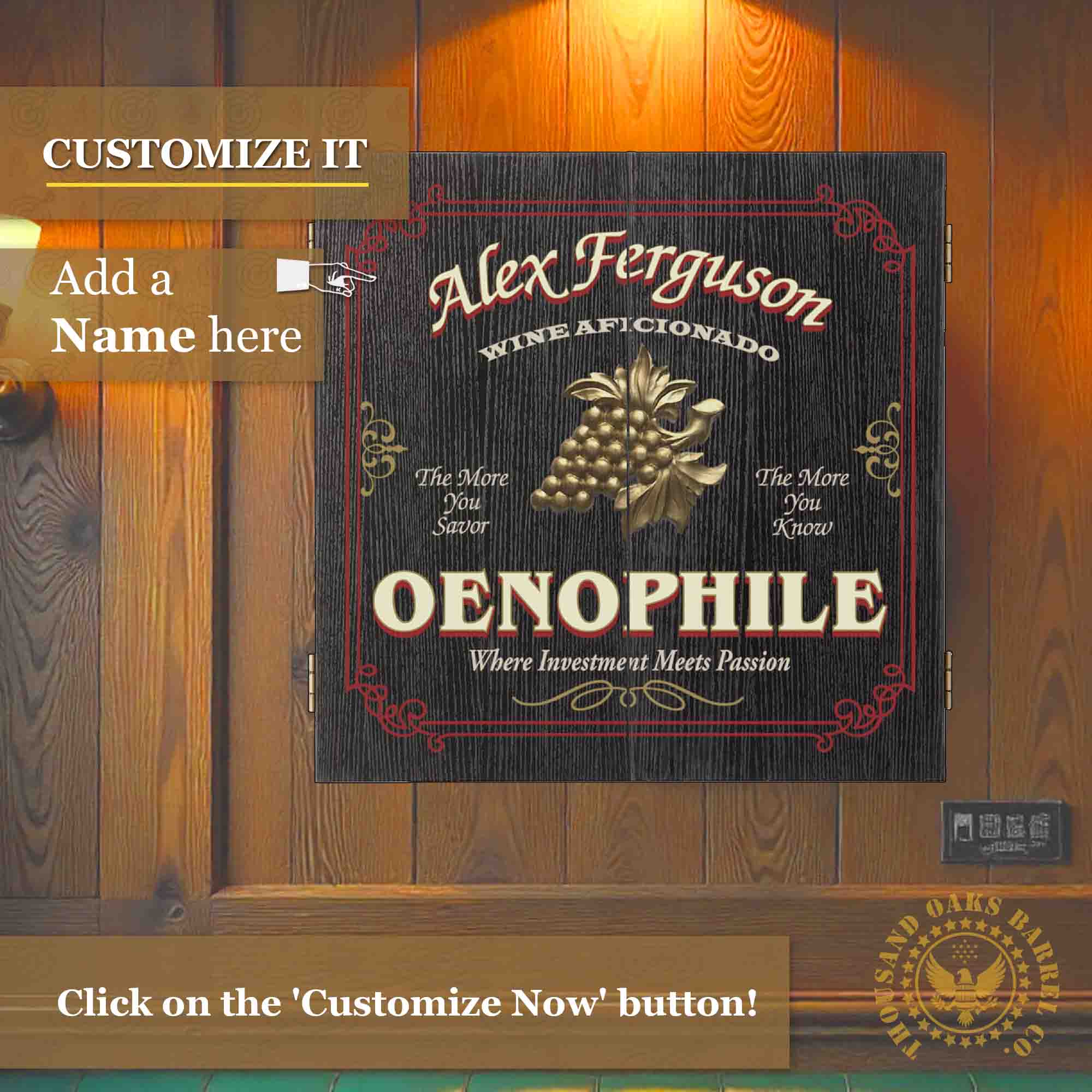 Featuring a vintage-inspired woodgrain cabinet, elegant grape cluster artwork, and bold “Oenophile” typography, this personalized dartboard makes a sophisticated statement in wineries, tasting rooms, wine cellars, home bars, and upscale game rooms.