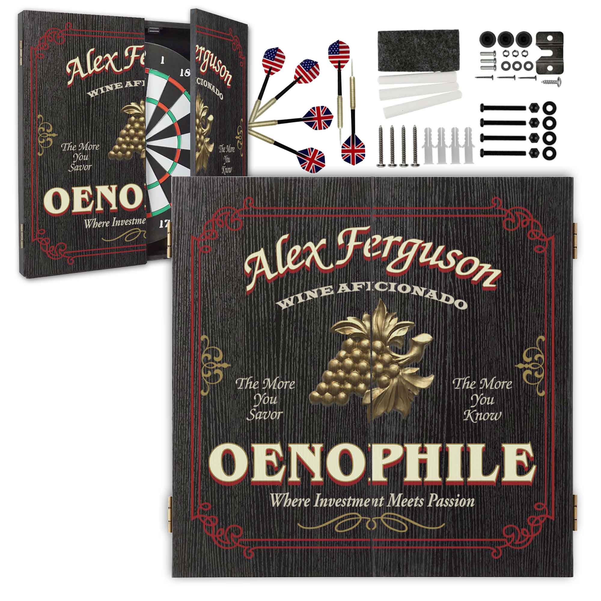 Celebrate a passion for fine wine with this Personalized Oenophile Dartboard Cabinet Set — a custom name dartboard designed especially for wine lovers, collectors, sommeliers, vineyard owners, and true wine aficionados.