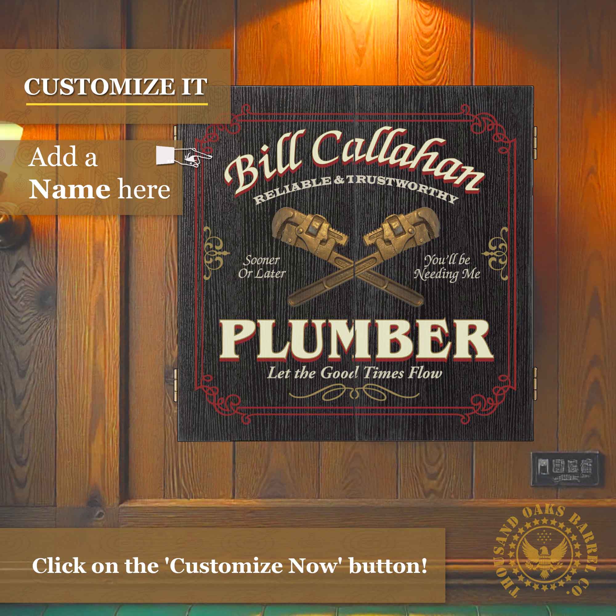 Designed with a vintage woodgrain look, bold “Plumber” typography, and crossed pipe wrenches, this custom dartboard cabinet can be personalized with any name to create a one-of-a-kind plumbing gift.