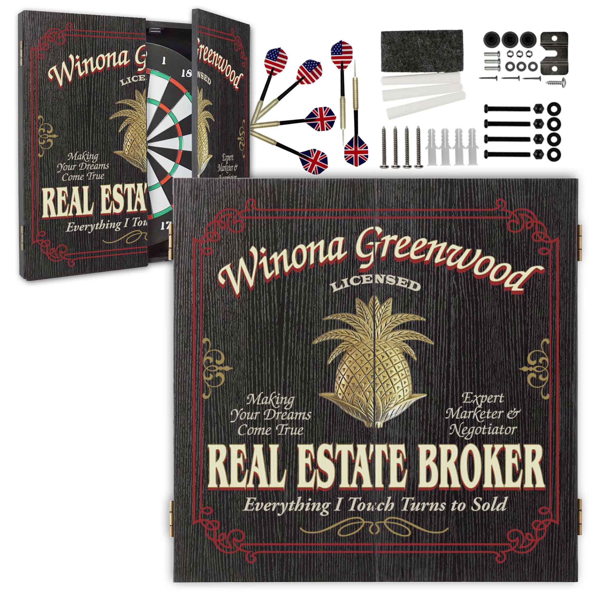This fully customizable dartboard cabinet features your chosen name prominently displayed in a bold vintage-style design, along with “Licensed,” “Real Estate Broker,” and the tagline “Everything I Touch Turns to Sold.” It’s the perfect blend of professionalism and personality — ideal for offices, home game rooms, man caves, or client entertainment spaces.