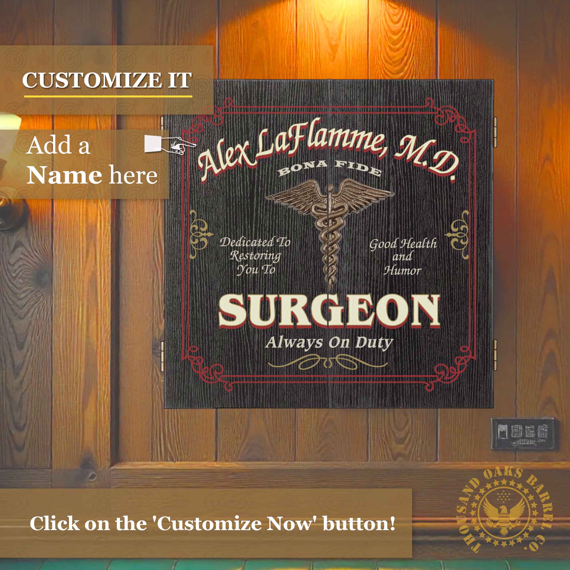 Featuring a bold medical-inspired design with a classic caduceus emblem, this custom surgeon dartboard allows you to add any name and credentials directly into the artwork — creating a one-of-a-kind centerpiece for a medical office, home office, man cave, or game room.