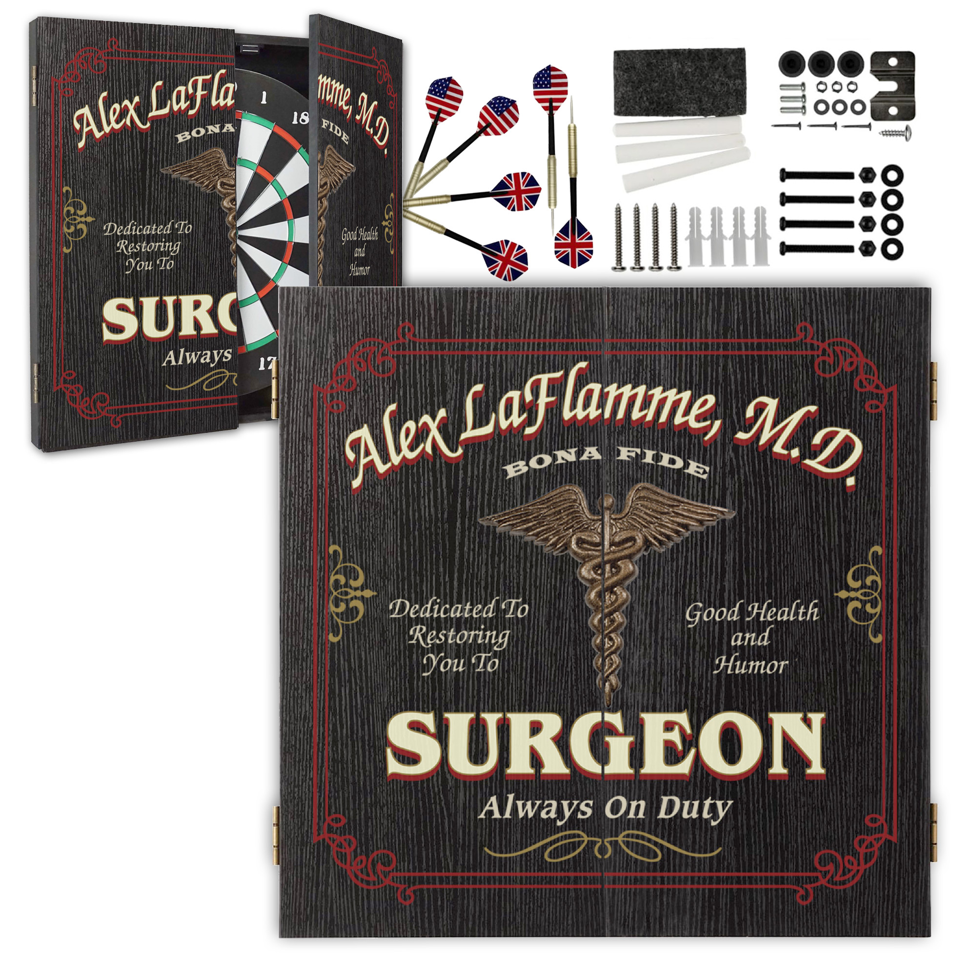 Looking for the perfect gift for a surgeon or a unique way to upgrade a medical office? This Personalized Surgeon Dartboard Cabinet Set is the ultimate combination of professional pride and interactive fun.