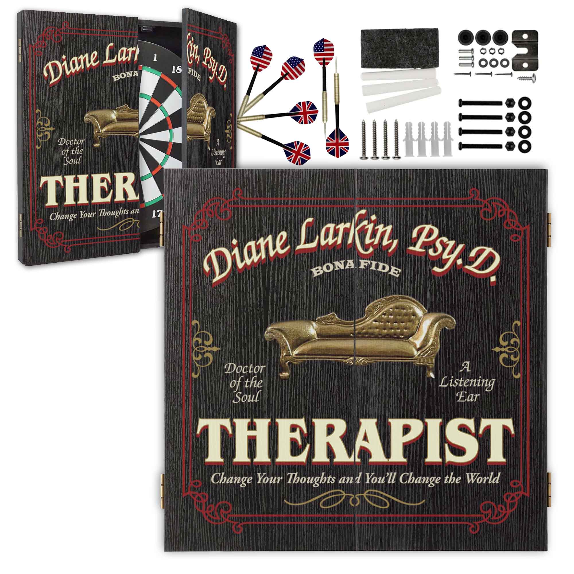 Our Personalized Therapist Dartboard Cabinet Set is a one-of-a-kind custom gift designed to celebrate dedication, compassion, and the healing power of listening.