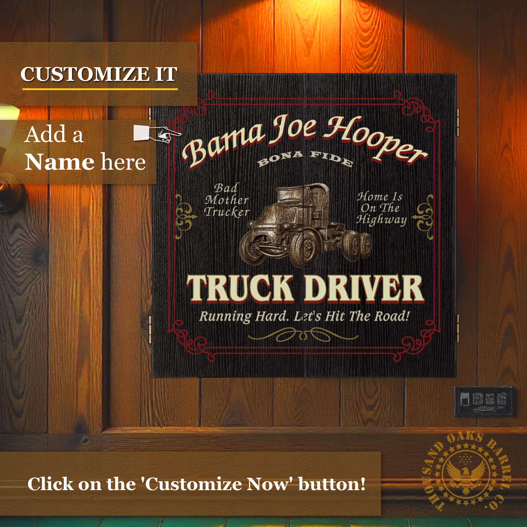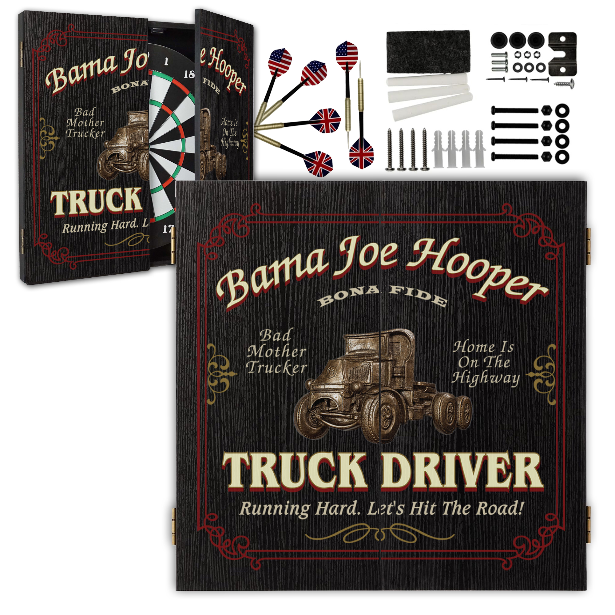 Whether he’s a long-haul legend, an owner-operator, or a weekend highway hero, this custom trucker dartboard cabinet transforms any garage, man cave, game room, or trucking office into a personalized statement space.
