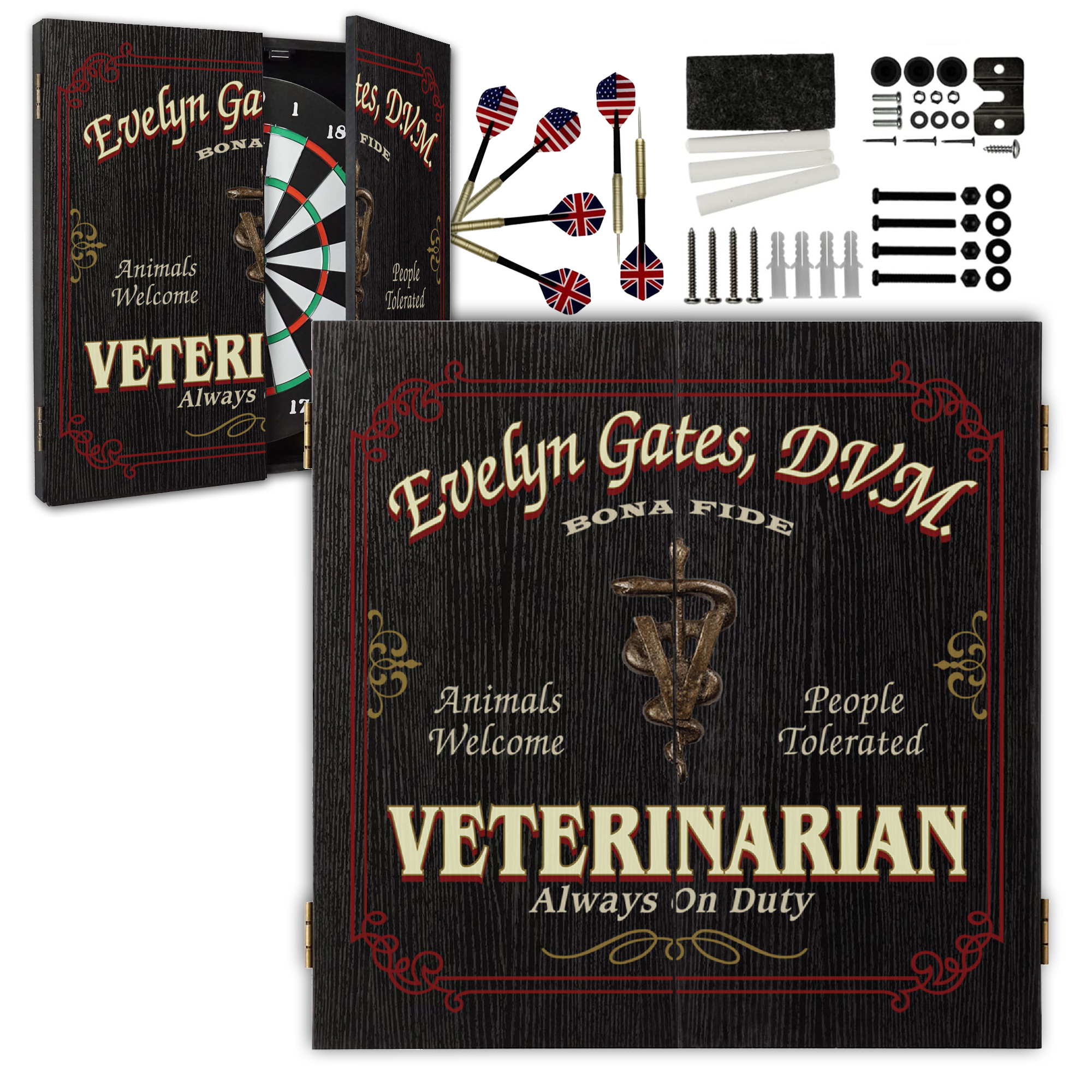Celebrate your passion for animals with a Personalized Veterinarian Dartboard Cabinet Set designed exclusively for veterinary professionals. Featuring a bold veterinary emblem design and custom name personalization, this premium dartboard cabinet transforms any office, clinic, home bar, or game room into a standout space.